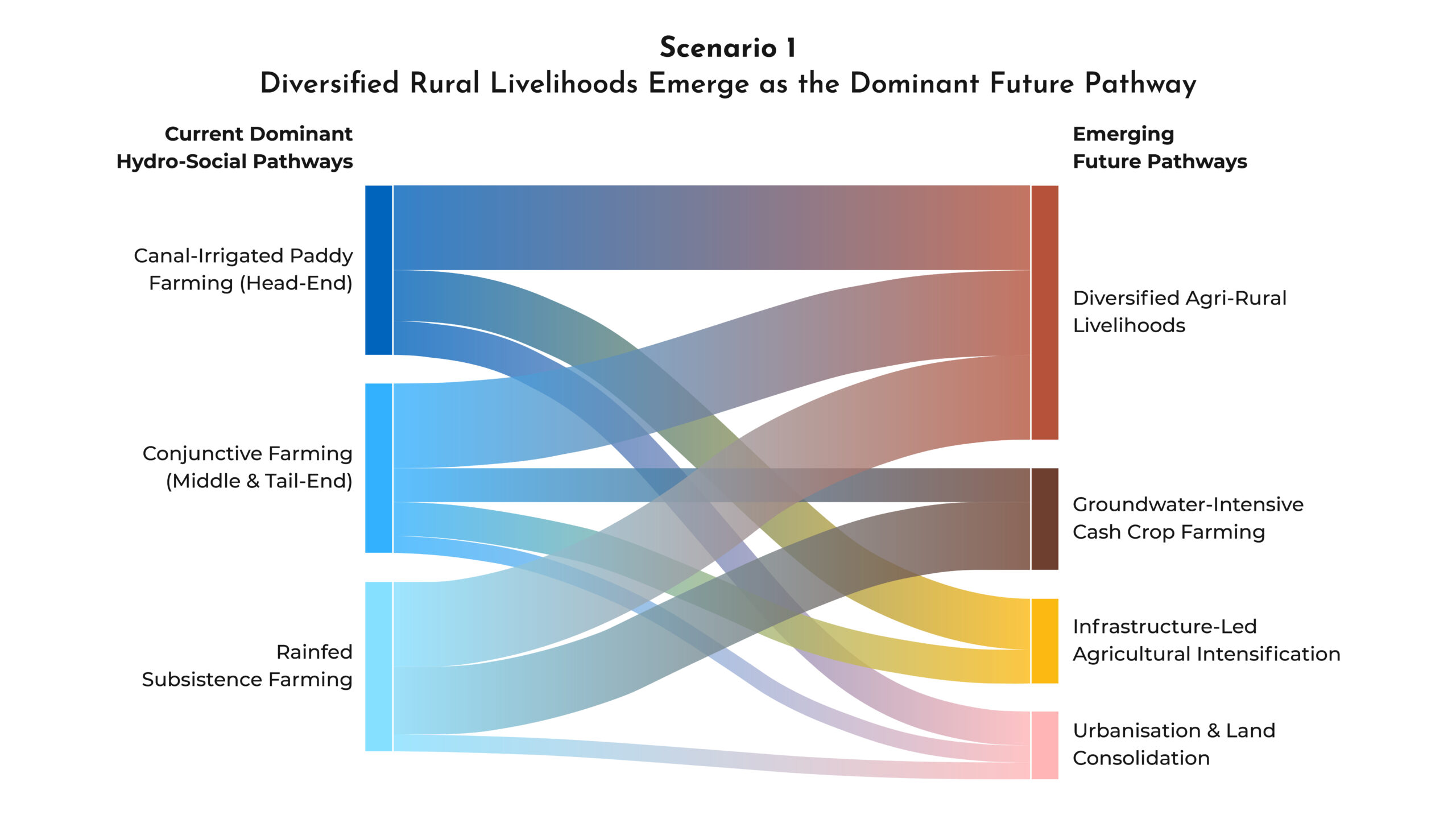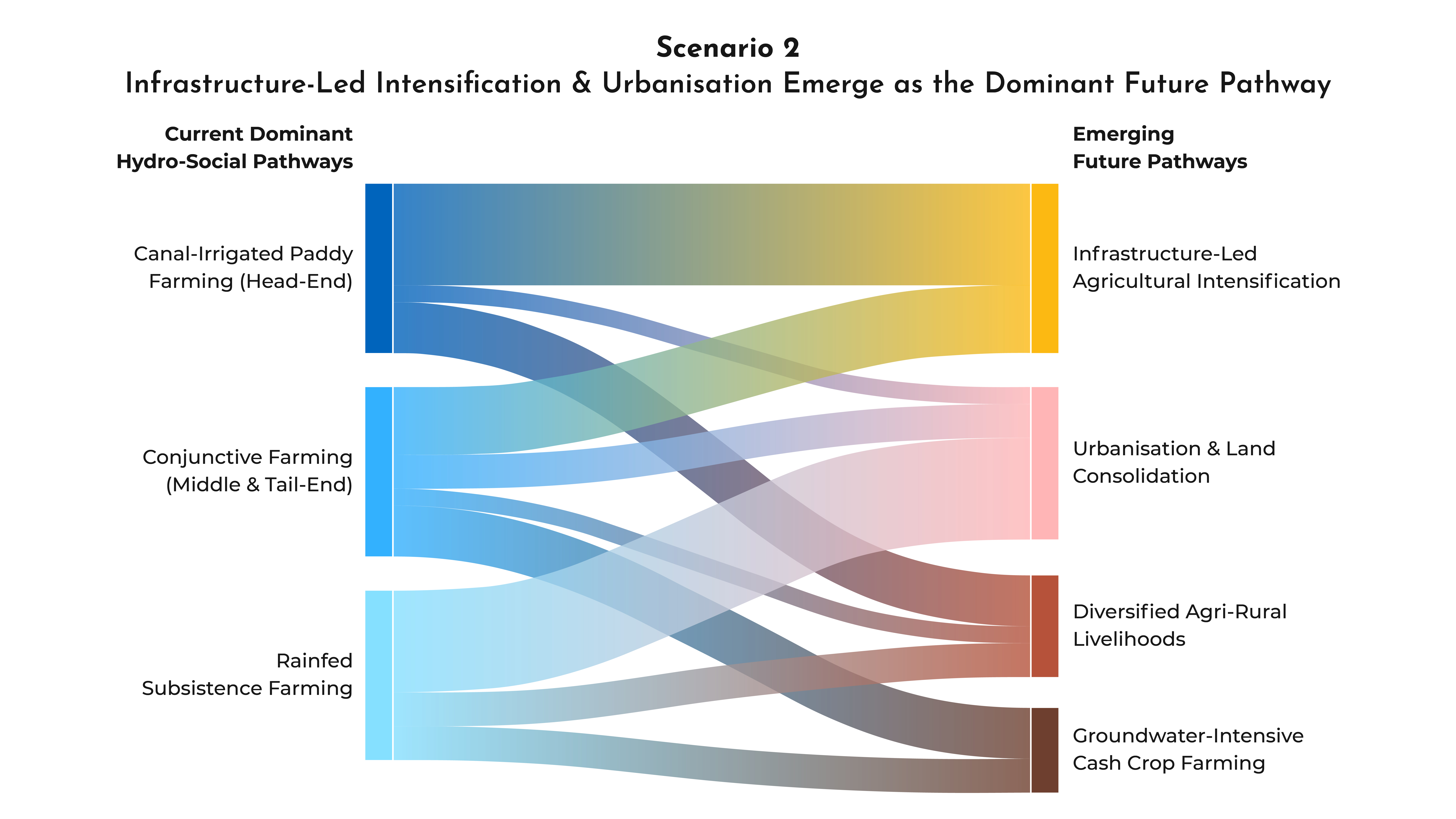- Canal command area with upgraded infrastructure and continued water-intensive crop production: A State-led push to modernise and automate canal infrastructure addresses current inequities in water distribution, but risks reinforcing the same paddy-dominated lock-ins if not accompanied by broader policy changes.
