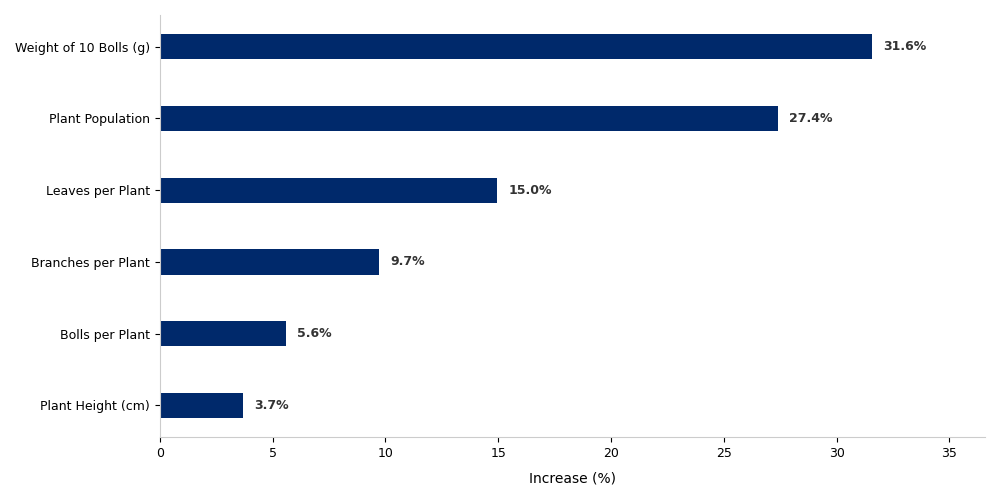 The results clearly demonstrate the benefits of strengthening seeds before sowing. Compared to untreated cotton plants, treated cotton plants reached a higher average height; had higher leaves per plant (reflecting greater photosynthetic capacity); showed improved branching; and had higher numbers of bolls (indicative of enhanced fruiting). Similarly, compared to the population of plants in the untreated plots, that in the treated plots was higher; plants in the treated plots also had heavier bolls, indicating better filling and lint quality. Thus, seed treatment leads to higher yield and improved crop quality.