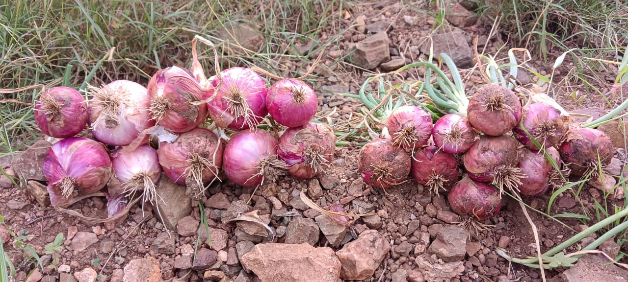 (Above) Treated onion seedlings provided bigger and healthier onion bulbs (left) compared to those harvested from untreated onion seedings (right). | Picture credit: Dashavanthappa Mudalagunda, Prarambha